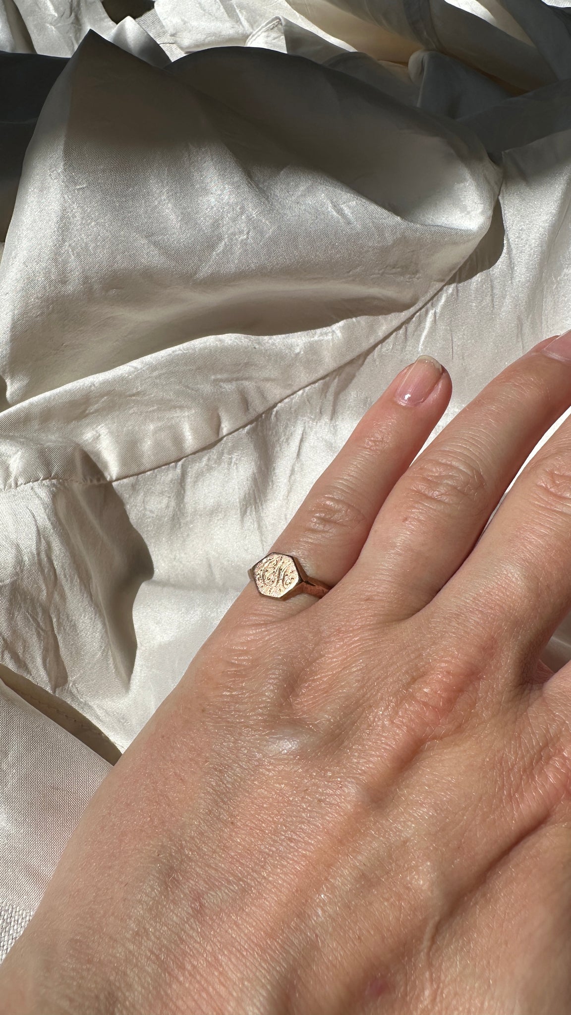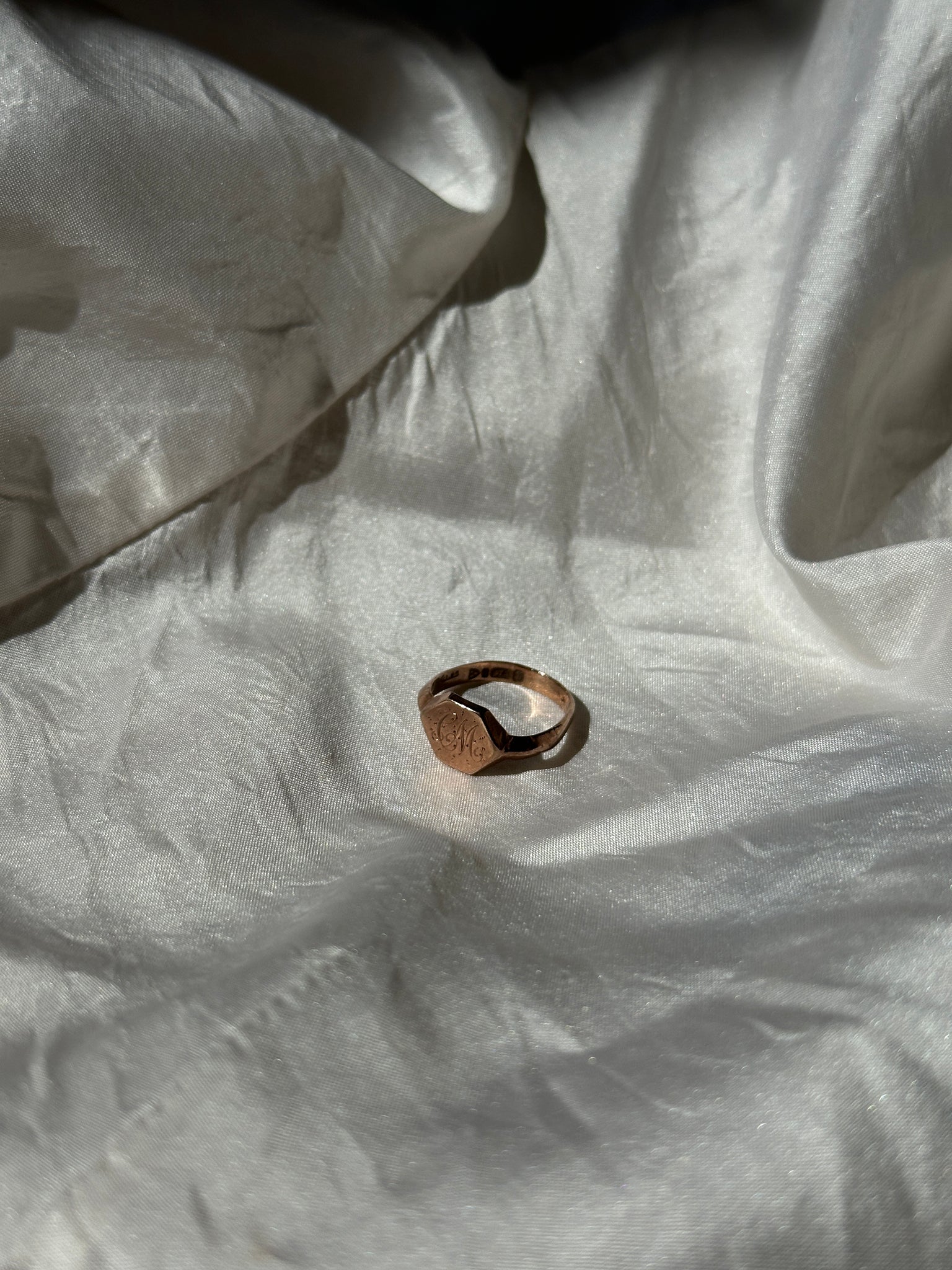 This is such a beautiful rare find, a stunning vintage rose gold 9ct gold signet ring engraved with the letters CM in an unusual hexagon shape. It weighs 2.5 grams and is size J. There is some minor misshaping on the band and there are signs of prior resizing.